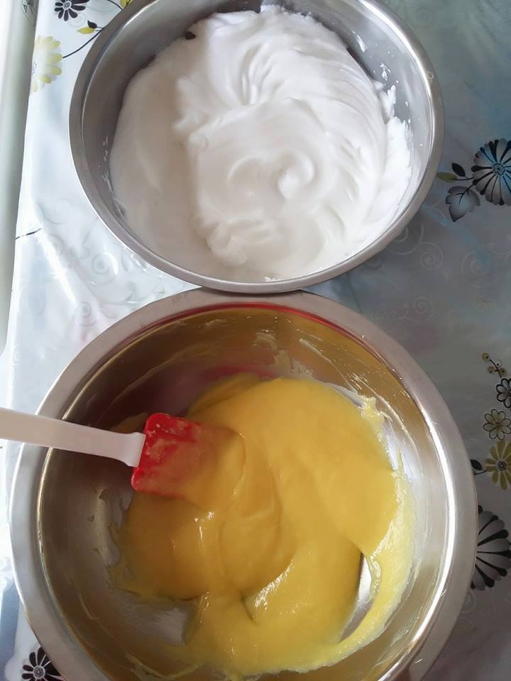 5. Masukkan satu pertiga meringue ke dalam adunan cheese, kaup balikkan. Ulangi sampai habis.
