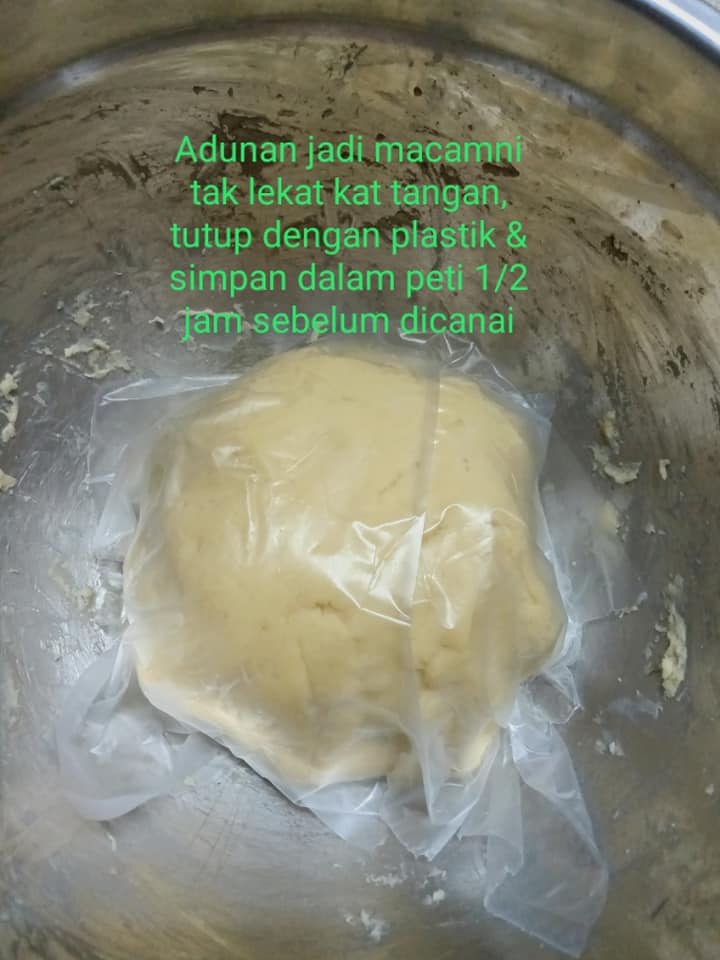 - Adunan akan jadi macam ni tak melekat dekat tangan. Tutup dengan plastik dan simpan dalam peti selama 1/2 jam sebelum di canai.