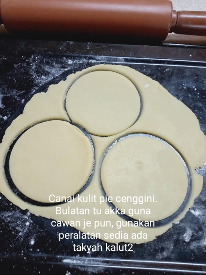 - Kemudian canai kulit pie macam ni. Bulatan tu boleh guna cawan.
