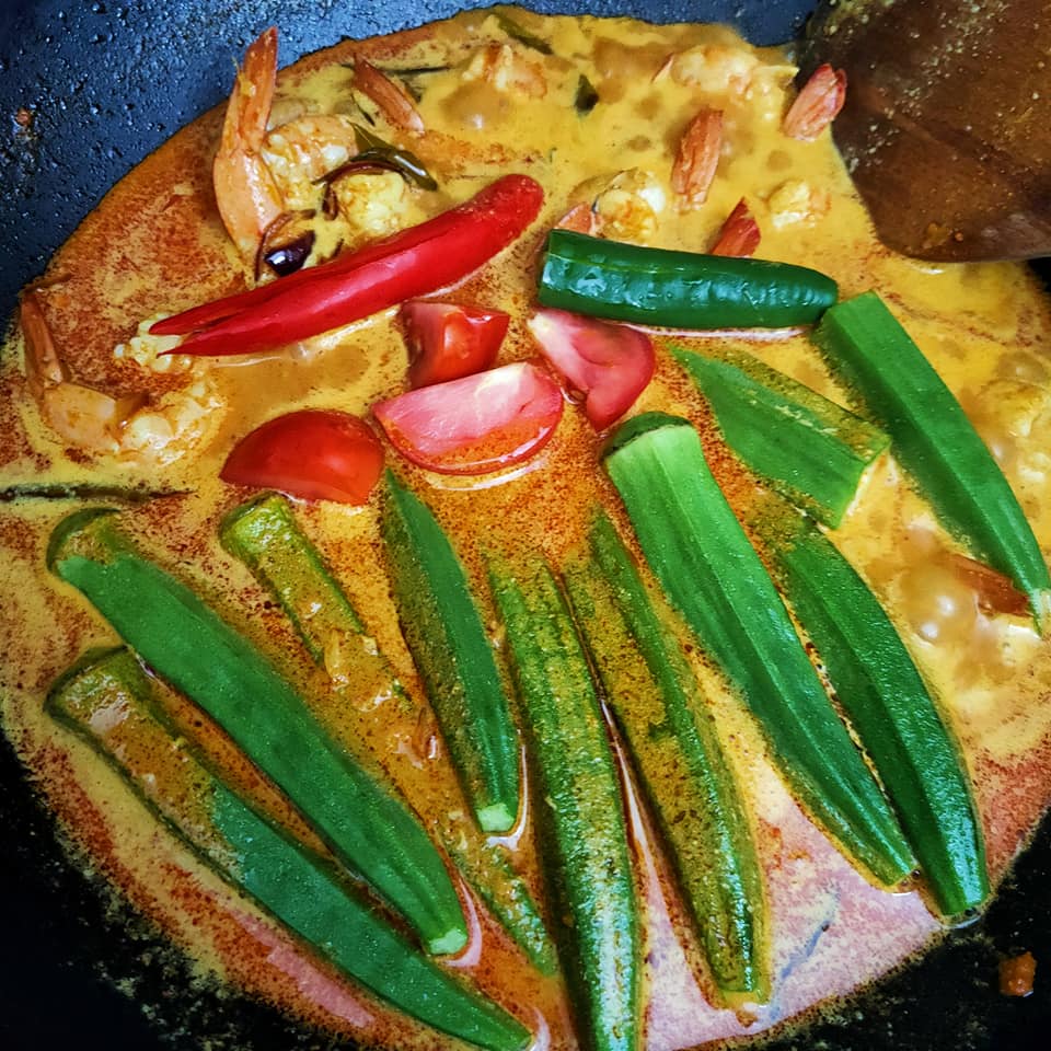 7) Masukkan Bendi, tomato, cili merah dan cili hijau. Biarkan kuah mereneh dan masak.