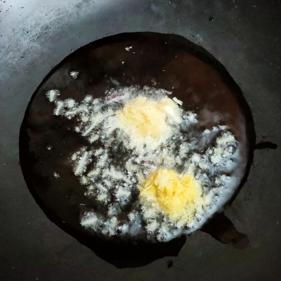 1) Panaskan minyak ke dalam kuali. Tumiskan bawang putih dan halia sehingga sedikit keperangan.