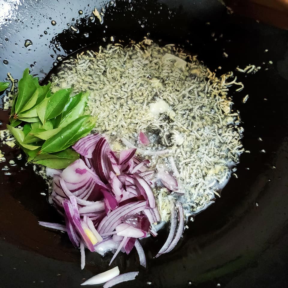 2) Masukkan daun kari dan bawang merah yang dihiris halus. Tumis sehingga keperangan.