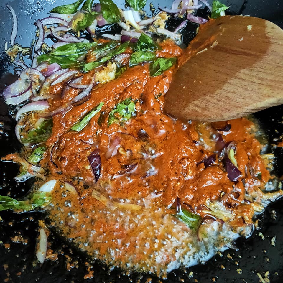 3) Masukkan rempah kari yang telah dijadikan paste tadi. Tumis lagi hingga pecah minyak (waktu ni, perlahankan sedikit api dapur). Kacau-kacau selalu supaya rempah tidak berkerak.