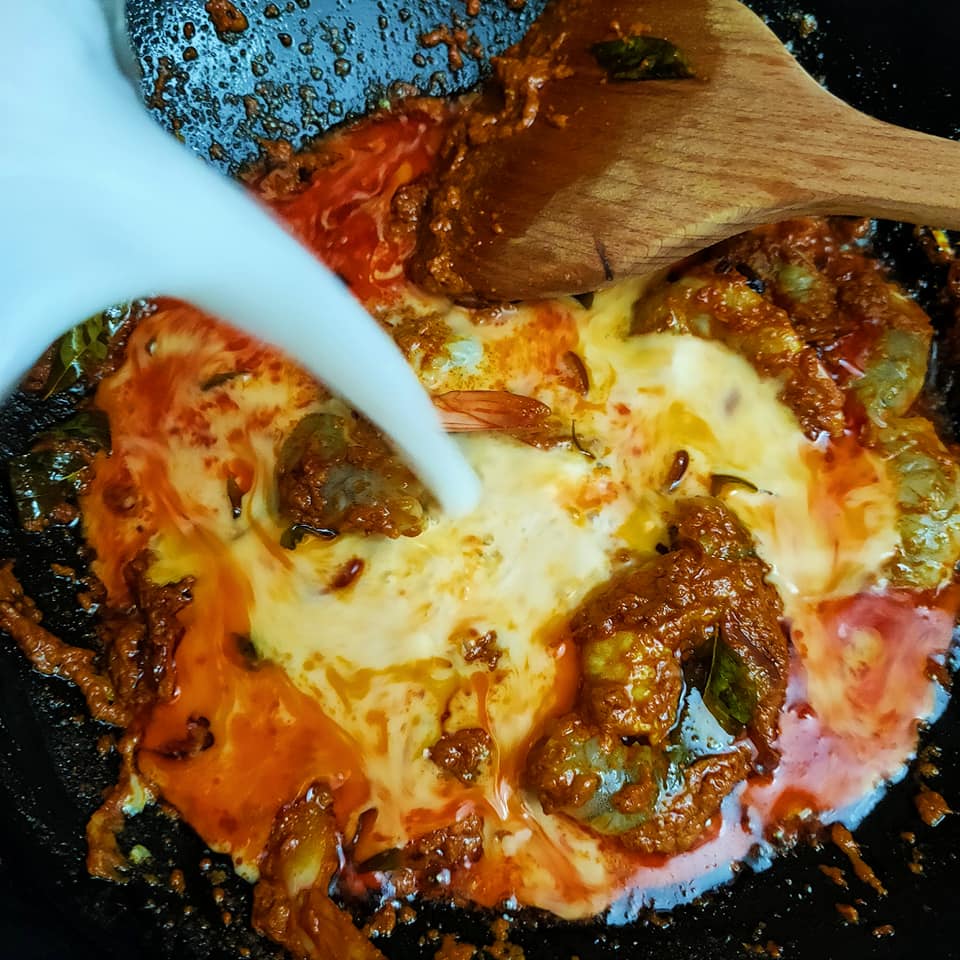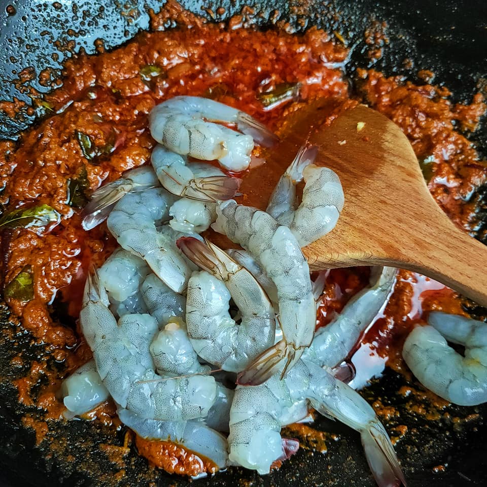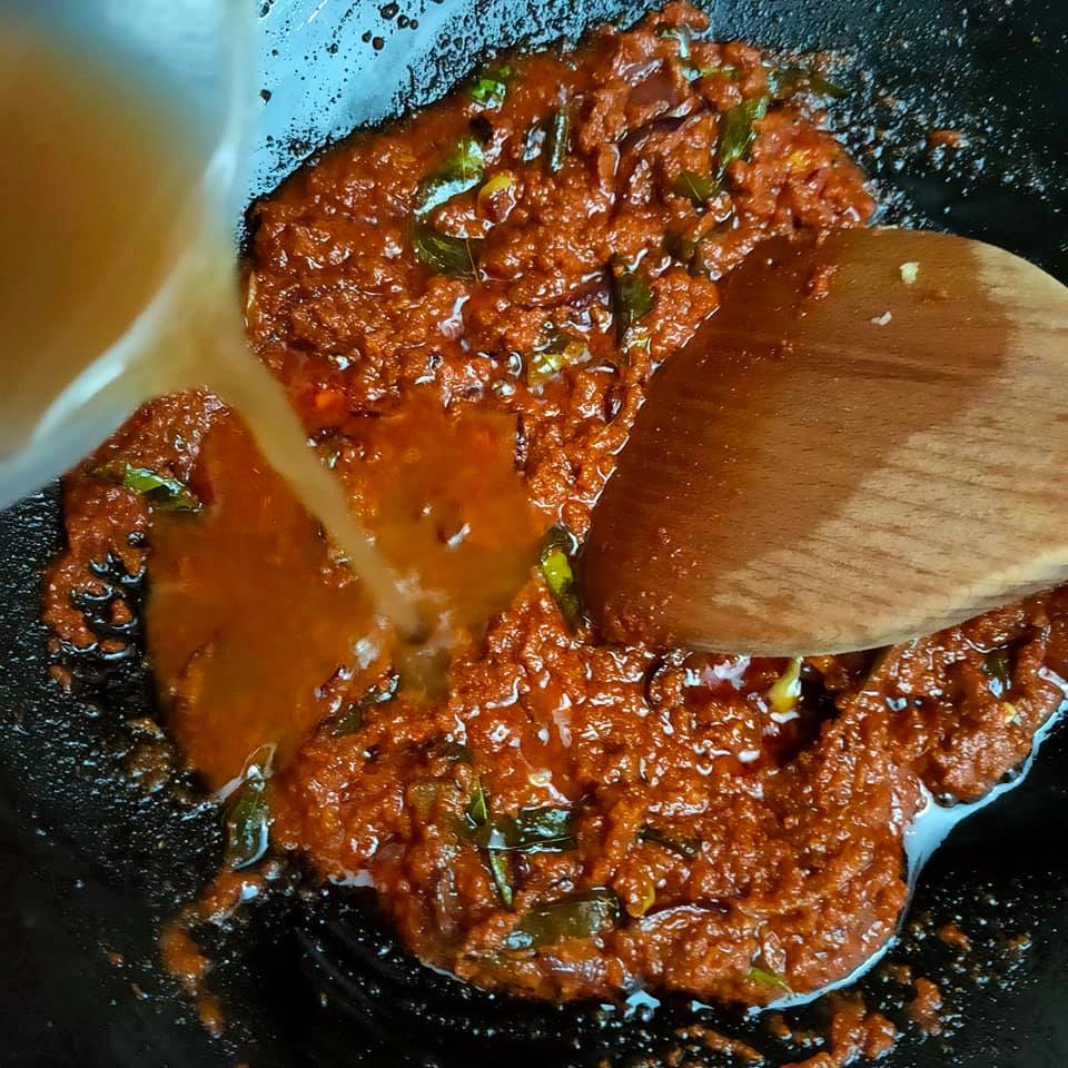 4) Apabila rempah sudah mulai pecah minyak dan masak, masukkan air asam jawa. Kacau sebati dan biarkan sebentar.
