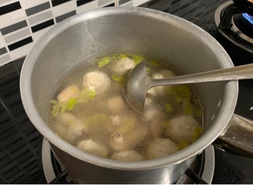 - Masukkan chicken meatball, kiub pati ayam dan air biarkan sampai masak.